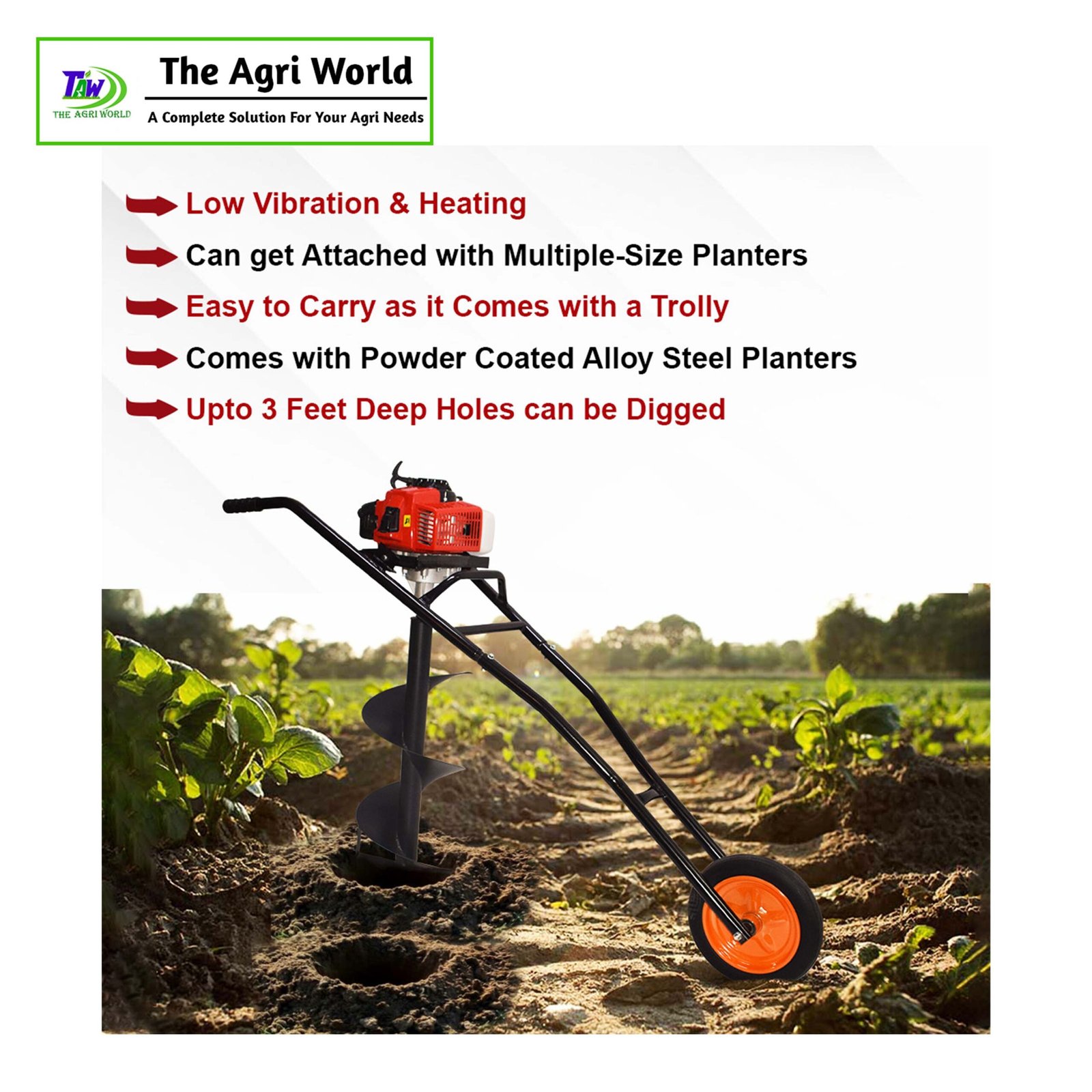 The TAW 63 CC 2 Stroke Trolley Earth Auger (Model: TAW–EA-6380) is a powerful and efficient tool designed for drilling holes in the ground, often used for tasks like post hole digging, fencing, or planting trees. Here’s a detailed description of the product: